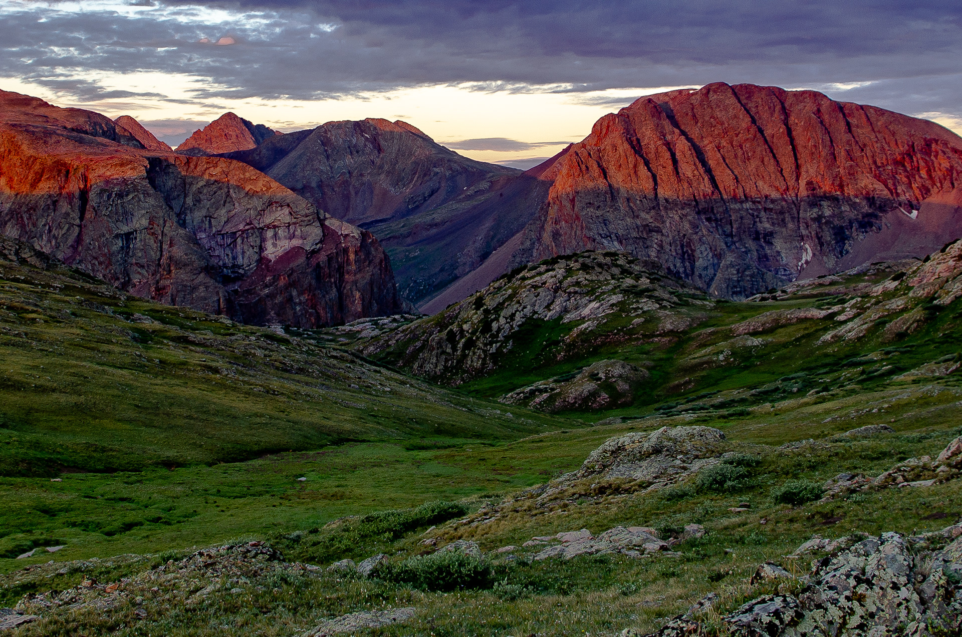 The sun's first rays graze the summits of the San Juan mountains in the Weminuche wilderness of southwest Colorado.
